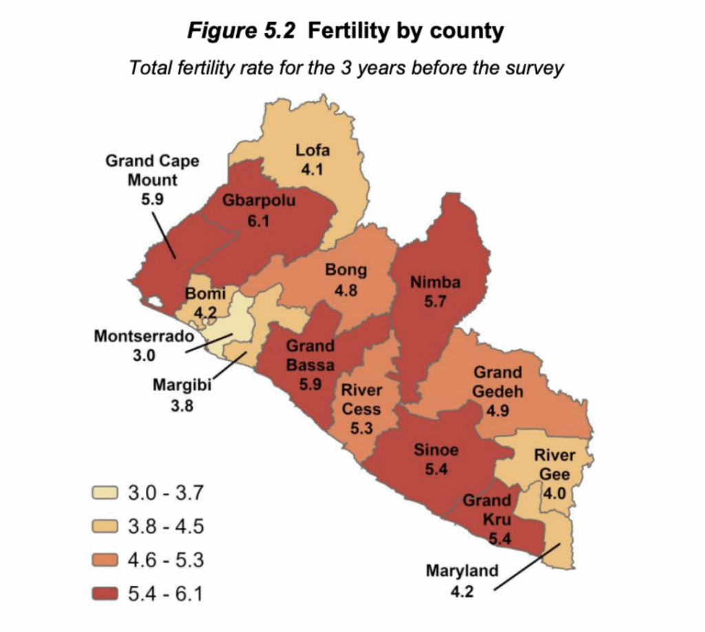 From the Liberia Demographics Health Survey (LDHS): The average number of children per woman declines with increasing education. Women with no education have an average of 5.3 children, as compared with 2.0 children among women with a higher education