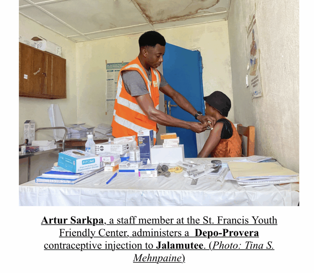 On a bright Tuesday morning in Cesto, Rivercess County, Angelina Jalamutee, 25, walks to the St. Francis Hospital Youth Friendly Center (YFC). She is there for her scheduled Depo-Provera shot, a family planning injection she receives every three months.